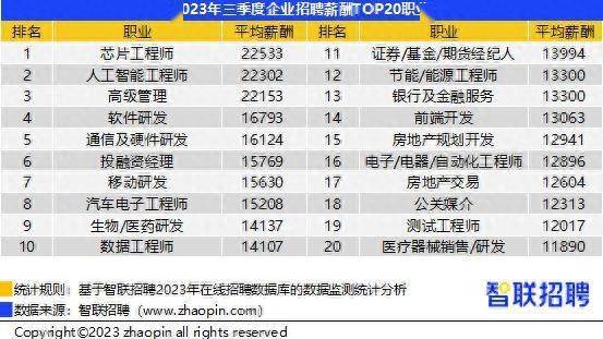 从职业看,芯片工程师持续处于高薪职业榜首,三季度平均招聘月薪为22533元。人工智能工程师的招聘月薪22302元,较二季度上升2.8%,排名由第三位回升至第二位。本季度房地产规划开发、房地产交易岗位薪资分别环比上升12.4%、7.5%,排名分别上升至第十五、第十七位。近期房地产市场的各项利好政策,促进房地产交易回升,相关岗位薪资也随之上涨。